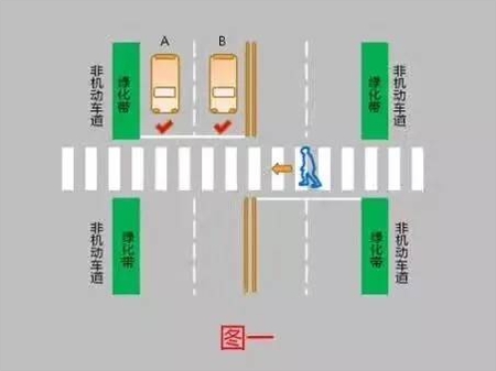 圖一:行人在道路右幅人行橫道行走、未抵達道路中心線時,在左幅道路行駛的機動車A、B應(yīng)當減速行駛,可在確保安全的前提下通過人行橫道。