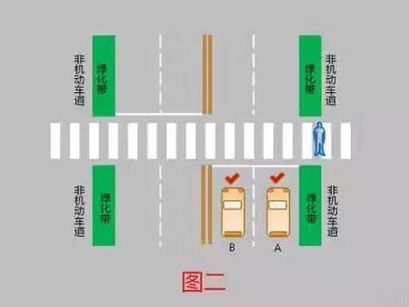 圖二:行人在機動車道、非機動車道分隔線外側(cè)等待,未進入機動車道,機動車A、B應(yīng)當減速行駛,可在確保安全前提下通過人行橫道。