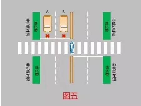 圖五:行人在道路中心線等待、未進入機動車A、B所在車道,機動車A、B未停車讓行的,屬于違法行為。