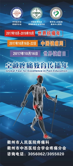?? 值此“中國鎮(zhèn)痛周”來臨之際,衢州市人民醫(yī)院疼痛醫(yī)學(xué)專家將于2017年10月16日上午在西區(qū)美年大健康(白云中大道39號,吾悅廣場對面)開展義診活動。屆時將針對大家最為關(guān)注的常見慢性疼痛性疾病如頭痛、頸椎病、肩周炎、腱鞘炎、帶狀皰疹后神經(jīng)痛、骨質(zhì)疏松性疼痛、晚期癌痛、頸腰椎間盤突出癥、坐骨神經(jīng)痛、膝關(guān)節(jié)炎、髖關(guān)節(jié)病等疾病進行現(xiàn)場免費咨詢,同時有機會獲得免費沖擊波及紅外偏正光治療。
