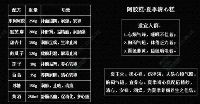 ??? 阿膠滋陰潤(rùn)燥、補(bǔ)血益氣,配以黑芝麻、南瓜子、甜杏仁、蓮子和百合等,清心健脾,潤(rùn)肺益腎。夏季清心糕配伍精妙,清心、安神、潤(rùn)燥,為夏季養(yǎng)顏養(yǎng)生佳品。