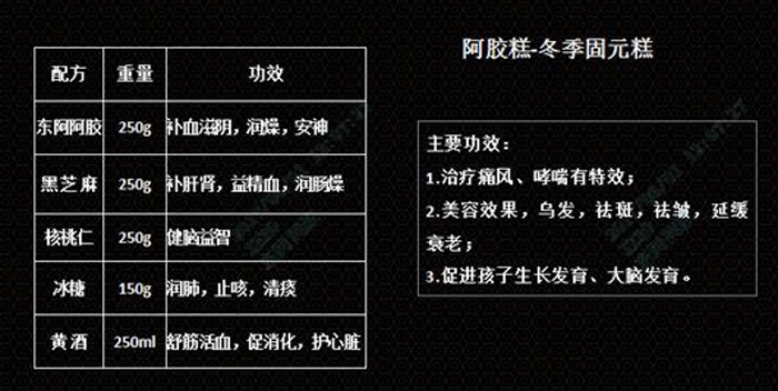 ??? 阿膠固元糕也叫“阿膠核桃糕”,配以核桃仁、黑芝麻、冰糖,用黃酒熬制而成。具有補(bǔ)血滋陰,潤(rùn)燥,止血之功效;用于血虛萎黃,眩暈心悸,心煩不眠,肺燥咳嗽等癥。