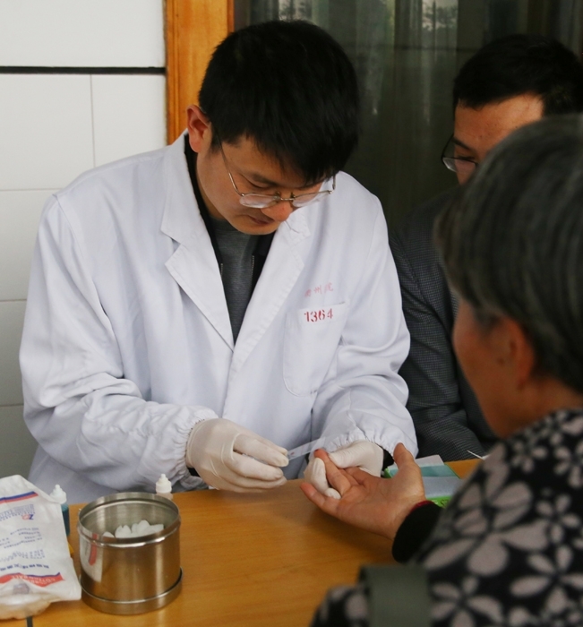 慕名前來的居民說:“這些專家平時(shí)工作很忙,有時(shí)候去醫(yī)院花錢都難得碰到他們坐診,沒想到在這里免費(fèi)碰到了。希望醫(yī)院今后能多組織一些這樣的活動(dòng)?!眻D為專家在為居民測血型。周雅琴王倩倩攝