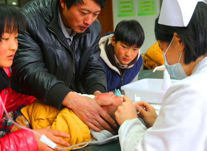 ??? 圖為2月14日,在市人民醫(yī)院輸液室,一位孩子正在打針。