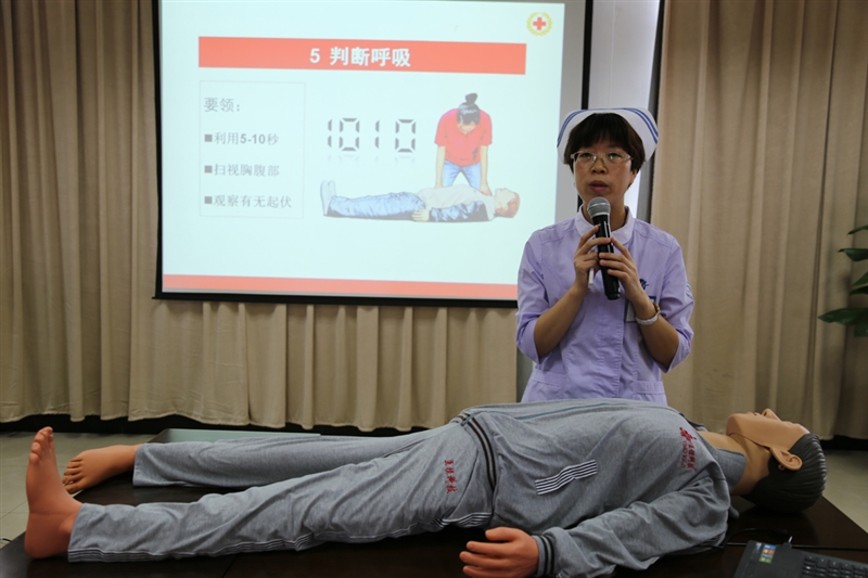 ??? 為了鞏固所學(xué)知識(shí)、增強(qiáng)操作能力,門(mén)診片護(hù)士長(zhǎng)邵微穎攜帶專(zhuān)業(yè)用品與運(yùn)用現(xiàn)場(chǎng)道具,現(xiàn)場(chǎng)對(duì)各學(xué)員進(jìn)行急救場(chǎng)景模擬,輔導(dǎo)其急救的正確流程、方法。