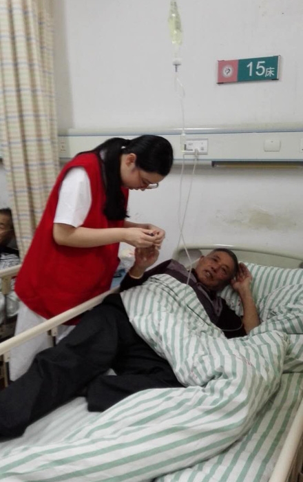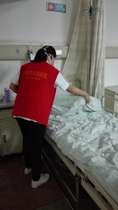 ??? “大伯,要掛號(hào)嗎?請(qǐng)到自助掛號(hào)機(jī)這邊來(lái),我教您怎樣操作?!被颊哂幸蓡?wèn)時(shí),志愿者前來(lái)解答;患者排隊(duì)時(shí),志愿者幫助疏導(dǎo);患者不理解時(shí),志愿者耐心解釋?zhuān)换颊咝袆?dòng)不便時(shí),志愿者上前攙扶。以往,在門(mén)診大廳里,活躍著身穿“紅馬甲”的志愿者身影。如今,志愿者活動(dòng)延伸到了病房,為患者提供著各類(lèi)志愿服務(wù):幫忙看護(hù)、陪伴病人、護(hù)送病人檢查等,向他們表達(dá)關(guān)懷和鼓勵(lì)。