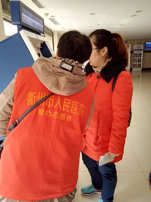 ??? 王金妹、周素珍、潘正照 、譚惠娟、周土蘭等5人在衢州市人民醫(yī)院做志愿者,主要來(lái)自社會(huì)志愿者。 志愿者們主要為患者指路引導(dǎo),陪伴行動(dòng)不便、年老體弱患者就診,指導(dǎo)患者自助服務(wù)機(jī)使用方法,引導(dǎo)患者化驗(yàn)前取號(hào)、打印化驗(yàn)單,協(xié)助門(mén)診大廳工作人員疏導(dǎo)病人。