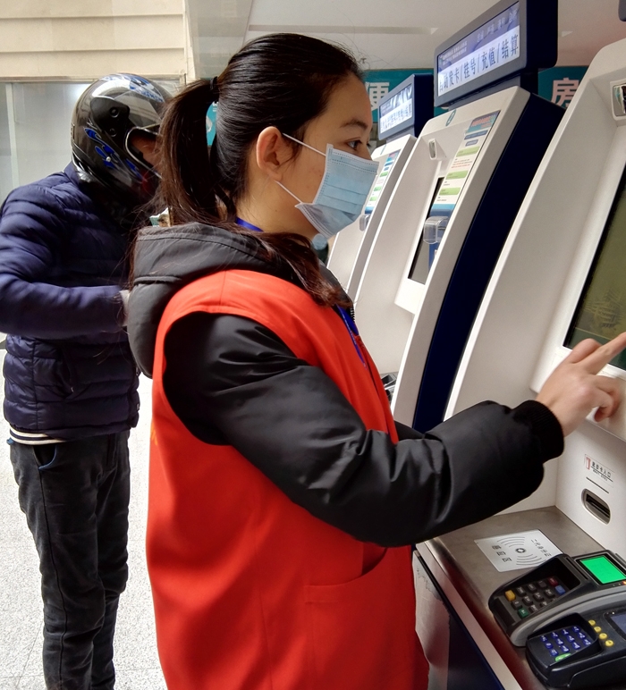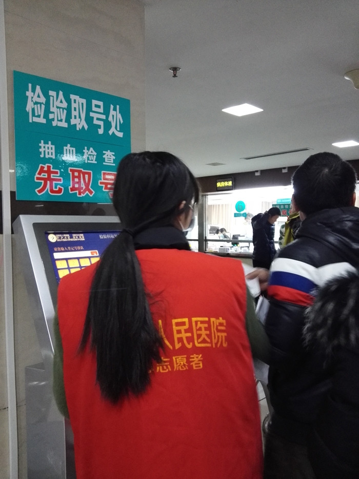 ??? 余慧晨、徐思惠、張莘陟、徐安琪、呂丹、陳玉瑩、徐怡、周孟穎、周慧娟、毛如意、鄭琦慧、葉佳蕓、王喬梅、王宇寧等14人在衢州市人民醫(yī)院做志愿者,主要來(lái)自寒假學(xué)生志愿者。 志愿者們主要為患者指路引導(dǎo),陪伴行動(dòng)不便、年老體弱患者就診,指導(dǎo)患者自助服務(wù)機(jī)使用方法,引導(dǎo)患者化驗(yàn)前取號(hào)、打印化驗(yàn)單,協(xié)助門診大廳工作人員疏導(dǎo)病人。