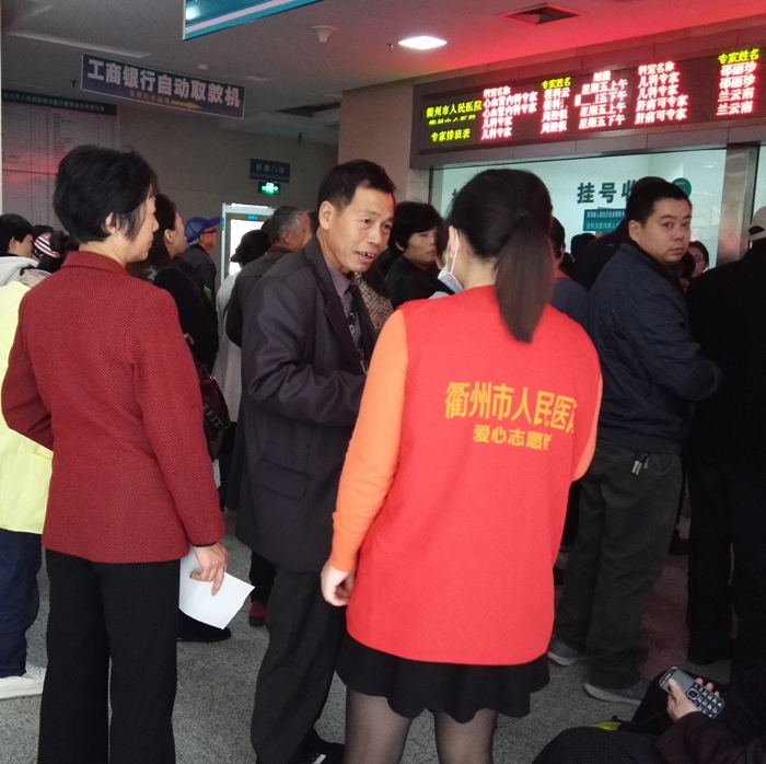 志愿者日志38 文章來源:門診部 作者: 點擊數(shù):8000 更新時間:2015-12-18 2015年12月7日???? 星期一 ??? 丁潔元、豐學謙、胡曉芬、鄭紅燕、童玲玲、陳彩英、黃玲、王琍穎等11人在衢州市人民醫(yī)院做志愿者,他們累計時間500余小時。志愿者們主要在門診大廳一樓至五樓接受患者咨詢、引導自助機服務方法、流動服務,幫助身體虛弱及身心障礙者等提供引導、協(xié)助門診大廳工作人員疏導病人。 ? ? 上一篇: 衢州市人民醫(yī)院愛心服務中心(試行) 下一篇: 在市人民醫(yī)院感受真情------一位志愿者在醫(yī)院服務感言