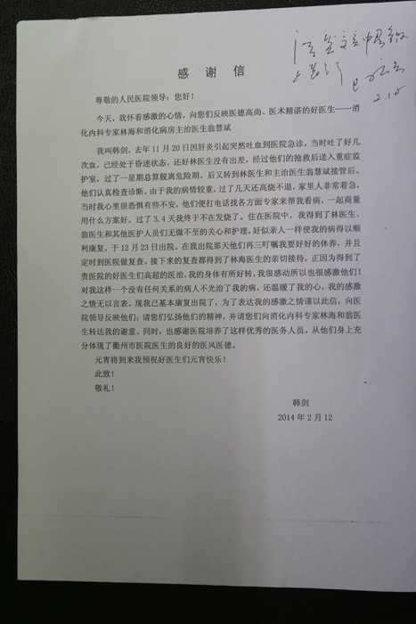 感謝信(致消化內(nèi)科林海、翁慧斌)