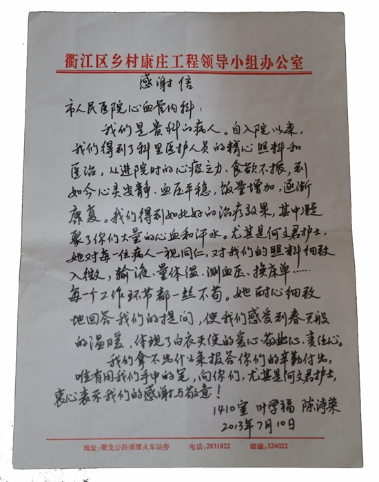 感謝信(致心血管內(nèi)科) 文章來(lái)源: 作者: 點(diǎn)擊數(shù):8905 更新時(shí)間:2013-08-21 上一篇: 感謝信 下一篇: 感謝信(致余俊華醫(yī)生)