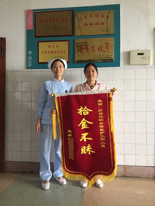??? 護(hù)士發(fā)現(xiàn)皮包里竟然有厚厚一疊人民幣,趕緊聯(lián)系給徐英和家屬。半小時(shí)后,失主趕到,確認(rèn)里面的一萬(wàn)多塊錢分文未少。當(dāng)場(chǎng)就拿出現(xiàn)金要感謝王阿姨,被王阿姨拒絕了。于是他們送來(lái)了錦旗對(duì)王阿姨拾金不昧的行為表示感謝。