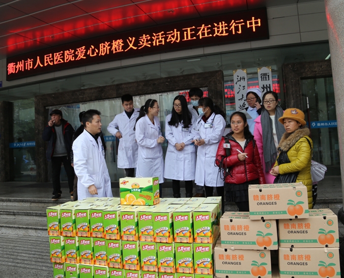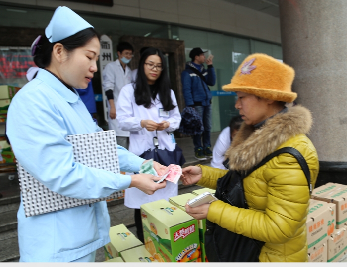 ??? 12月21日下午,在我院門診大廳門口擺放著一箱箱臍橙,原來是腫瘤內(nèi)科主任鄭勤紅及護(hù)士長張小芳組織科室醫(yī)務(wù)人員在為癌癥患者謝冬蓮舉行愛心義賣,籌集愛心款。