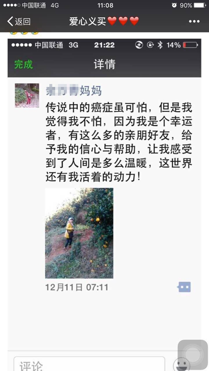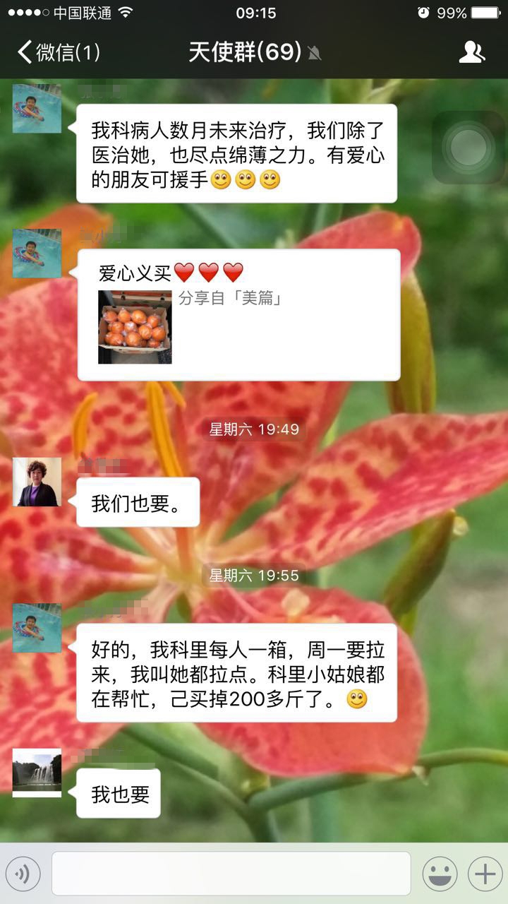 ??? 鄭勤紅一直關(guān)注著這個多難的家庭,得知此事后立即通過微信向院內(nèi)的醫(yī)護(hù)人員發(fā)出求助信息,消息一經(jīng)發(fā)出,院內(nèi)的醫(yī)務(wù)人員紛紛向謝冬蓮伸出援手,經(jīng)過的路人、看病的患者見此情景也紛紛鼎力相助,十箱、二十箱……熱心的企業(yè)老板得知消息后立即訂購200箱臍橙,向謝冬蓮捐款一萬多元,目前,我院的醫(yī)務(wù)人員已經(jīng)幫助謝冬蓮售出600多箱臍橙,為謝冬蓮籌集資金四萬余元。