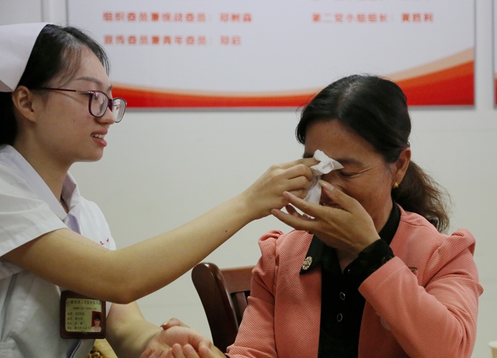 ??? 聽說要找的好心姑娘就在市人民醫(yī)院上班,早上9點還不到,周女士和丈夫便捧著鮮花和錦旗趕到醫(yī)院。雙方見面后,周女士抑制不住流下感激的眼淚?!拔抑挥浀媚翘祢T著騎著就暈了,再有意識時已經(jīng)躺在醫(yī)院,我女兒說是個跟她差不多年紀的姑娘送我來的。我是個有恩必報的人,找不到好心人心里就有個疙瘩,所以再困難也要找到她?!敝芘考拥卣f,“沒想到她也在醫(yī)院里工作,還跟我同姓,真是緣分。