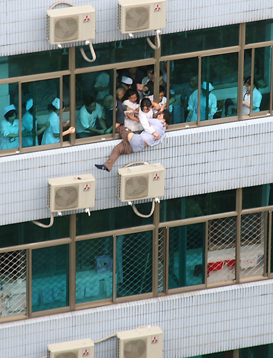 ??? 08年夏天的一個(gè)早上,鄭迎夏正和主任、同事查房到1407房時(shí),突然聽(tīng)見(jiàn)隔壁1406房有很大的動(dòng)靜,她立即跑到外陽(yáng)臺(tái),只見(jiàn) 19床的病人已經(jīng)打破窗戶爬到空調(diào)外機(jī)上了。她不假思索的沖上前拉住他的雙臂往里拽,但這個(gè)病人有迫害妄想癥,越拽他越掙扎,就想往下跳。危急時(shí)刻,在場(chǎng)的實(shí)習(xí)醫(yī)生、陪護(hù)紛紛上前幫著鄭迎夏拉病人,可是病人的情緒越發(fā)激動(dòng),整個(gè)人懸空著,瞪著眼睛,歇斯底里地大叫著,企圖掙脫所有拉他的人,還給了鄭迎夏臉上一拳,過(guò)了十來(lái)分鐘,病人的情緒稍稍平靜了,在趕來(lái)的保安幫助下合力將病人拉回陽(yáng)臺(tái)。見(jiàn)到病人沒(méi)事,松了一口氣的鄭迎夏眼睛一黑就都倒了下去。隨即被送往了急診科,此時(shí)的她雙手、雙臂、臉頰、衣服上滿是血跡。右手食指上整塊皮都被掀了,左手無(wú)名指上也留下很深的口子,清創(chuàng)后雙手縫了二十余針。