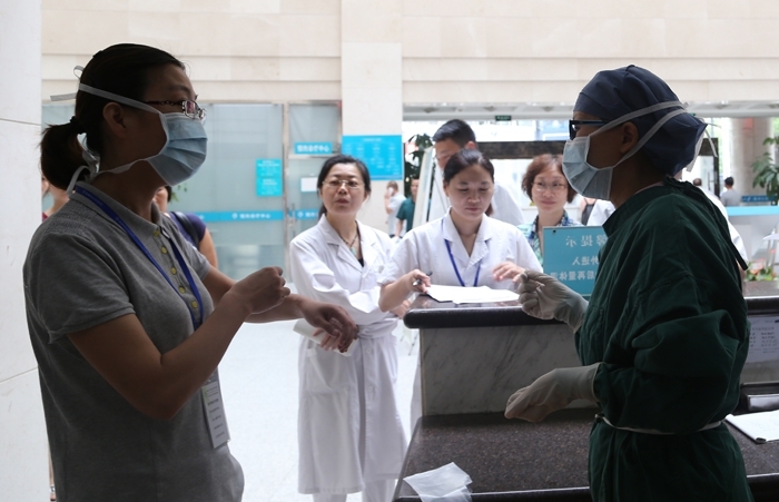 ??? 演練模擬一名從“利比亞疫區(qū)務(wù)工回國(guó)人員”,出現(xiàn)了腹瀉、腹痛、惡心、嘔吐、發(fā)燒等癥狀,疑似埃博拉病毒感染,到我院診治的場(chǎng)景。演練考核了醫(yī)護(hù)人員的防護(hù)穿戴、預(yù)檢分診、標(biāo)本采集接送、專家會(huì)診、病人轉(zhuǎn)院、現(xiàn)場(chǎng)消毒、應(yīng)急響應(yīng)等一系列流程,生動(dòng)、直觀地展現(xiàn)了防控疫情的全過程。