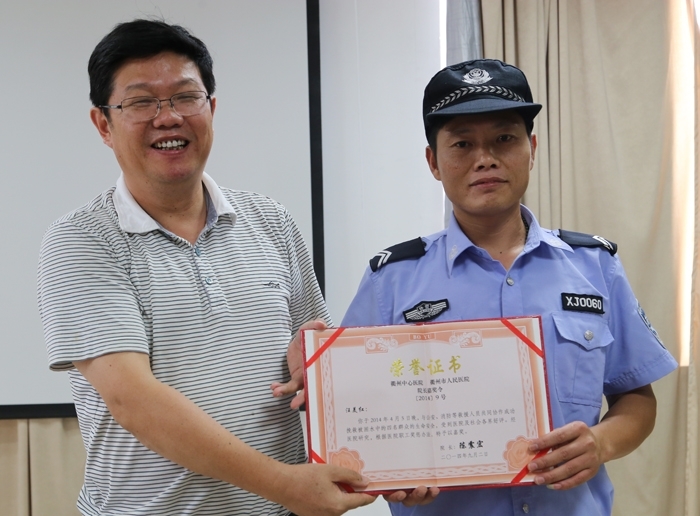 ??? 9月2日,醫(yī)院在院周會(huì)上表彰見義勇為、不顧自身安危的保安汪美紅,由院長(zhǎng)陳震宏對(duì)汪美紅發(fā)布嘉獎(jiǎng)令,授予汪美紅“見義勇為”獎(jiǎng)。