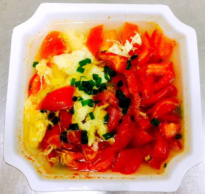 ??? 原料:西紅柿2個(gè)、雞蛋1個(gè)、肉湯適量、鹽、蔥花