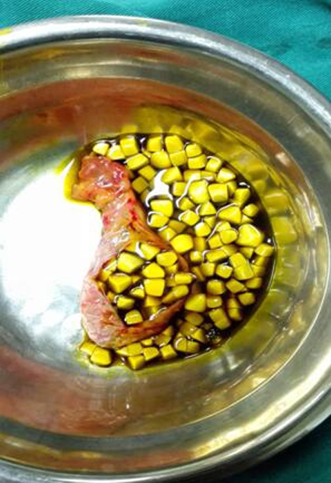 ???? 原來,徐阿姨通過腹腔鏡微創(chuàng)手術(shù)取出了膽囊,剖開后,里面竟充滿了玉米粒樣大小的結(jié)石,多達(dá)100余顆。