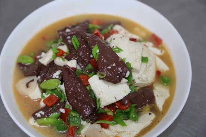 原料(豬血 200 克、嫩豆腐 200 克、蔥、姜、蒜、料酒等)