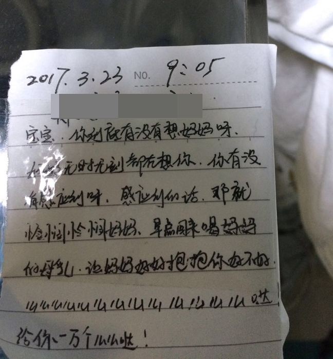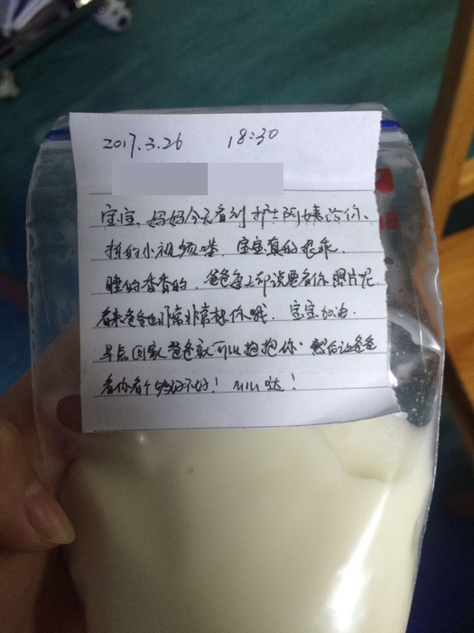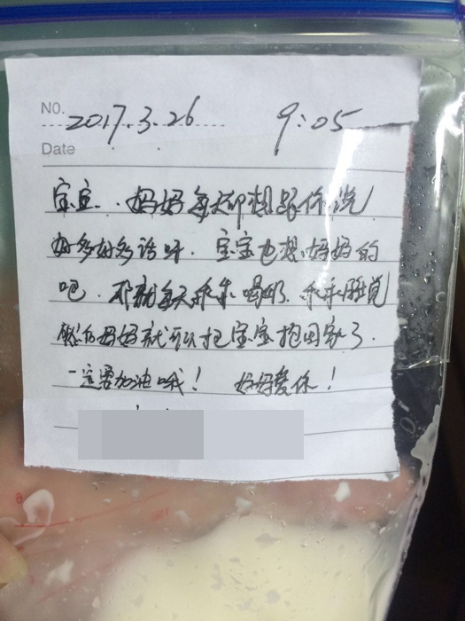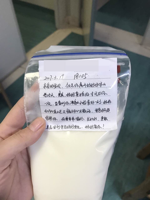??? 這一個(gè)多月里,小湯圓的媽媽每天都把母乳擠出來存在儲(chǔ)奶袋里,然后由爸爸帶到醫(yī)院交給醫(yī)護(hù)人員。她還每天給小湯圓寫信,這些母愛濃濃的字條,催人淚下。