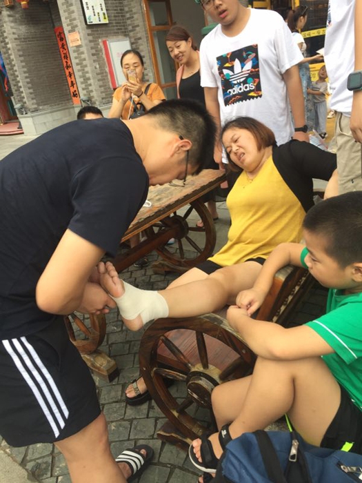 ??? 大媽左腳踝處有明顯紅腫,周圍肌肉僵硬,無法行走。因為事發(fā)突然,林瑜立即采取了應(yīng)急處理,經(jīng)過冰敷、手法復(fù)位后,大媽感覺疼痛得到了明顯的緩解。