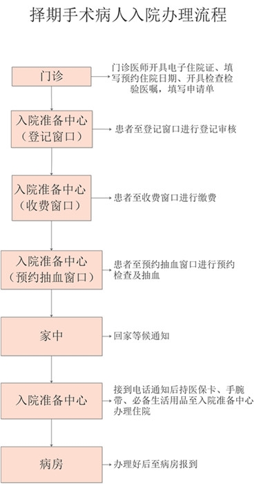 ??? 目前,除了感染科、兒科、ICU外,其余病區(qū)均可在入院準(zhǔn)備中心辦理入院手續(xù)。入院準(zhǔn)備中心適宜擇期手術(shù)的患者,直接入院患者及日間病房患者也可辦理。