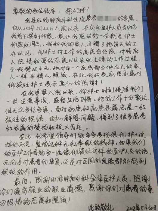 ??? 6月7日上午,我院肛腸外科護(hù)士長收到了一位患者家屬親筆書寫的感謝信,表達(dá)對仰筱旺護(hù)士的感激之情,并為肛腸外科醫(yī)護(hù)團(tuán)隊點贊。