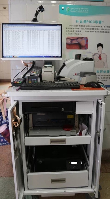 ??? 這臺(tái)移動(dòng)小車,配備有辦公電腦、票據(jù)打印機(jī)、醫(yī)??ㄗx卡器等設(shè)備,相當(dāng)于一個(gè)移動(dòng)的收費(fèi)窗口。工作人員來到病房進(jìn)行結(jié)算,真是既快捷又方便。支持醫(yī)??āy行卡、現(xiàn)金、微信、支付寶等結(jié)算方式。