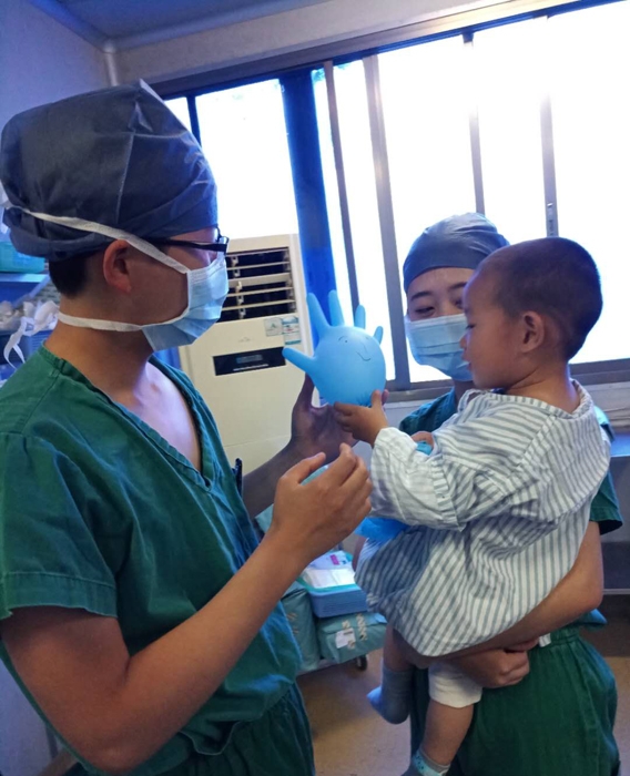 手術(shù)前,小患者哭鬧太厲害,董建用手套做了個玩具逗他