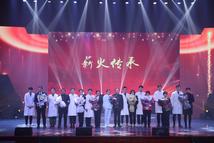 ? ? ? 晚會上還有一個“薪火傳承”的特殊環(huán)節(jié),是專為2017年光榮退休的22名員工而設(shè)立的,由2017年入職的新員工為他們獻(xiàn)花,以此來表達(dá)醫(yī)院對他們崇高的敬意和衷心的感謝!