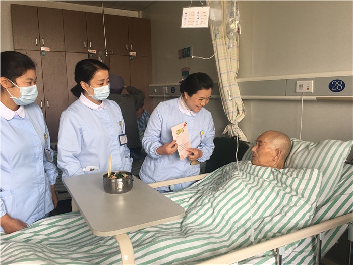 ??? 大家為王爺爺唱起了生日歌,這位年過(guò)八旬的老人也情不自禁的跟著唱了起來(lái),臉上露出了感激的笑容,就連隔壁床的病友家屬也加入其中送上了祝福。護(hù)士長(zhǎng)親自喂王爺爺吃面條,老人家拿著賀卡高興地說(shuō):“真心感謝你們,你們是美麗的天使!”