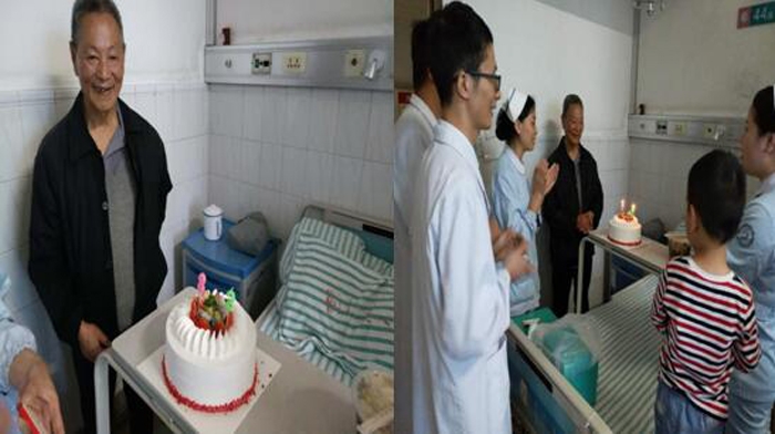 ??? 通過(guò)住院信息得知5月4日是老人的生日后,醫(yī)護(hù)人員便為老人送上了一碗熱騰騰的長(zhǎng)壽面。老人吃著一碗再普通不過(guò)的面條,心里卻無(wú)比感動(dòng)。老人覺(jué)得這碗面條讓他體會(huì)到了“家”的溫暖,更沒(méi)想到醫(yī)護(hù)人員把他當(dāng)成親人一樣。為了表示謝意,已經(jīng)因病多年不能吃甜食的老人特意到美妍蛋糕店買了一個(gè)蛋糕和大家一起分享,于是就出現(xiàn)了開(kāi)頭的那一幕。