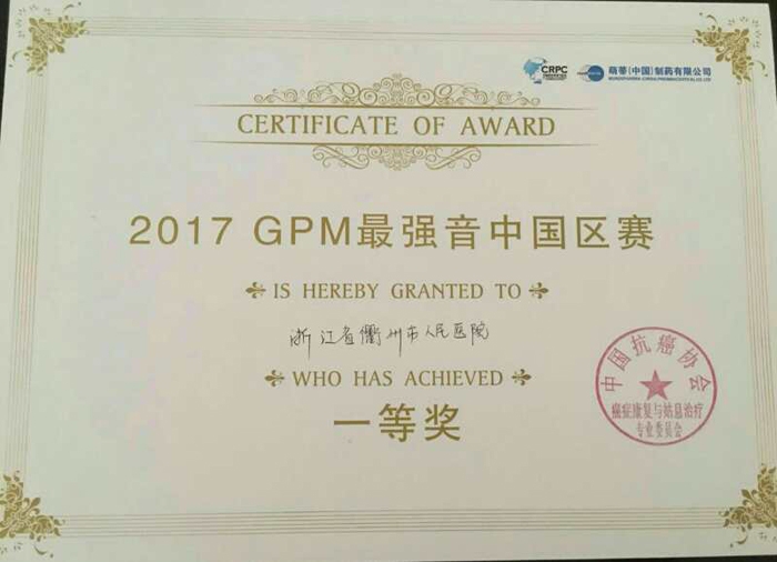 ??? 從2015年起,我院連續(xù)三年參加由中國抗癌協(xié)會主辦的GPM最強音演講比賽,自參賽以來,連續(xù)三年取得浙江賽區(qū)第一的佳績并進入華東地區(qū)決賽,而此次更是奪取了華東賽區(qū)的第一名而挺進了全國決賽,令全省抗癌專家刮目相看。