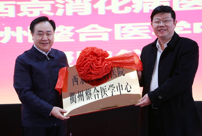 ??? 3月15日下午,第四軍醫(yī)大學(xué)西京消化病醫(yī)院衢州整合醫(yī)學(xué)中心揭牌儀式在我院五樓學(xué)術(shù)報(bào)告廳舉行。中國(guó)工程院院士、中國(guó)工程院副院長(zhǎng)、西京消化病醫(yī)院院長(zhǎng)、國(guó)際知名消化疾病專家樊代明與院長(zhǎng)陳震宏共同為“西京消化病醫(yī)院衢州整合醫(yī)學(xué)中心”揭牌。