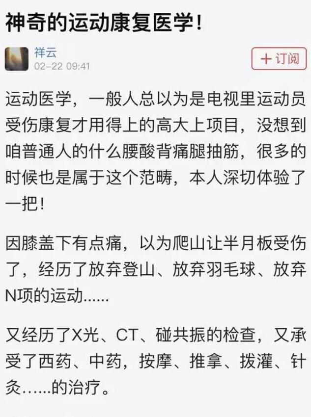 ??? 一個(gè)曾經(jīng)的運(yùn)動(dòng)達(dá)人,在左膝出現(xiàn)問(wèn)題后,體驗(yàn)了運(yùn)動(dòng)康復(fù)醫(yī)學(xué)的神奇治療,并大呼神奇!下面,就讓他帶我們?nèi)ァ耙?jiàn)證奇跡”吧!