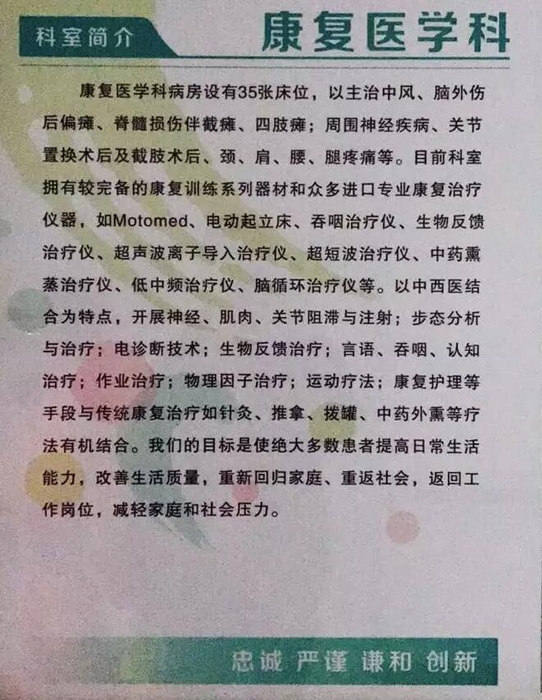 ??? 康復(fù)醫(yī)學(xué)科主要收治腦卒中、顱腦損傷后偏癱,脊髓損傷后截癱及頸肩腰腿痛等疾病。通過(guò)科學(xué)專業(yè)的康復(fù)治療能使偏癱或截癱患者早日脫離床上生活,提高日常生活能力。