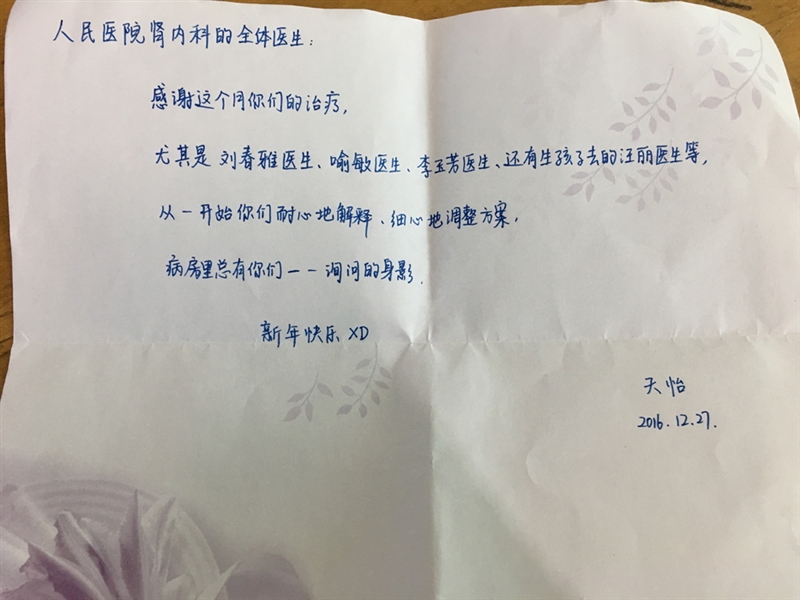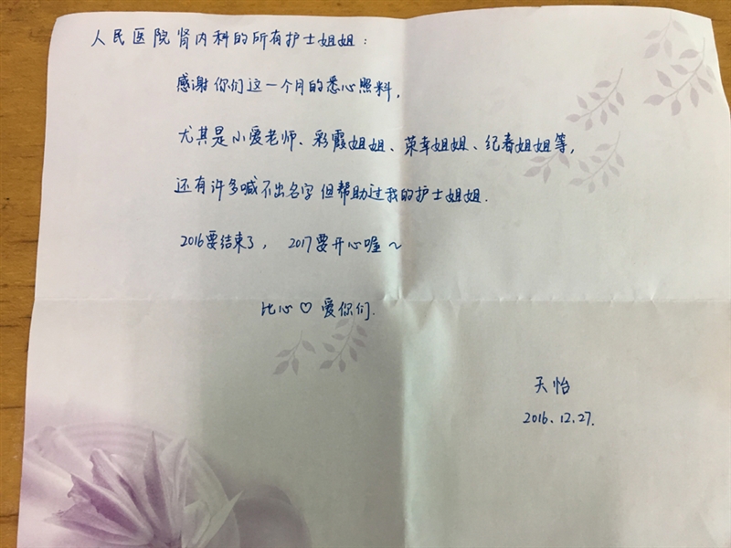 ??? 這不,天怡給醫(yī)生和護士們各寫了一封感謝信,把她叫得出來的醫(yī)護人員的名字一一羅列,感謝他們細心調(diào)整治療方案,以及一個月來的悉心照料,祝他們2017年過得開心!