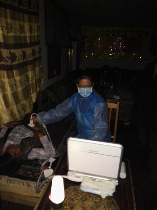 ??? 經(jīng)過短暫休整與適應(yīng),我所在的流調(diào)四組去的第一個(gè)篩查點(diǎn)是古露鎮(zhèn)俄瑪村。我們一行3人驅(qū)車4小時(shí)來到達(dá)俄瑪村居委會(huì),發(fā)現(xiàn)當(dāng)?shù)貤l件異常艱苦,沒有合適的B超檢查床,只能搬來桌椅,作為臨時(shí)擺放B超機(jī)及檢查床。剛剛擺放好開始檢查,又傳來了停電的消息。在西藏,停電是再普遍不過的事情??粗鹤永镌絹碓蕉嗟哪撩瘢瑸榱瞬蛔屗麄兪?,我們?cè)谟帽M了B超機(jī)內(nèi)置的電池后,村長(zhǎng)終于搬來了一臺(tái)發(fā)電機(jī),不敢耽誤一分鐘,終于完成了該村120多人的檢查,回到駐地已是晚上九點(diǎn)多。
