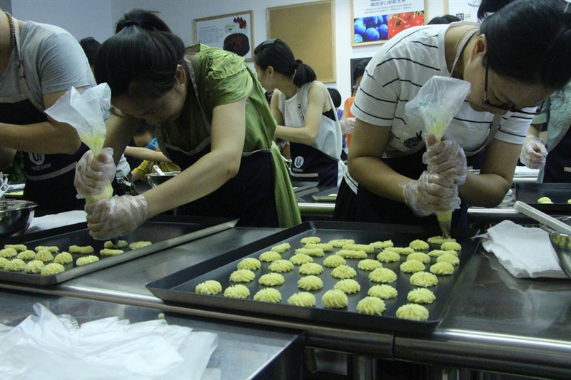 ??? 進(jìn)入操作間,學(xué)員們已經(jīng)整整齊齊地排列在操作崗位上。三十余名同學(xué)圍著圍裙,雙手戴著一次性手套,按照師傅的要求,把調(diào)好的蛋糊裝入裱花袋中,在烤盤里擠出來均勻的形狀,有一字型的,有圈圏的,有梅花狀的,各種各樣的花式,美不勝收。