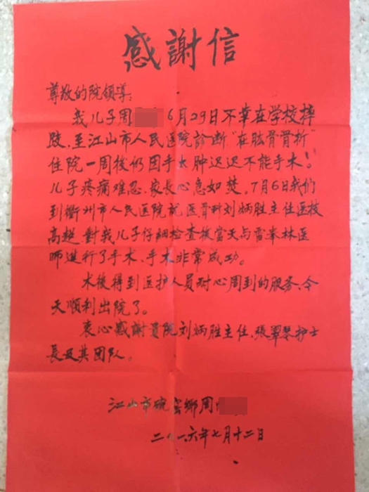 ??? 10歲的小周來自江山,6月29日,小周在學(xué)校玩耍時不慎摔跤,結(jié)果導(dǎo)致左肘部腫痛畸形,父母送小周在當(dāng)?shù)蒯t(yī)院檢查后發(fā)現(xiàn)小周“左肱骨髁間骨折”,住院一周后,小周左手肘部腫脹明顯,無法進(jìn)行手術(shù),家屬十分焦急,7月6日,家屬帶著小周來到我院骨科就診。在安撫患者家屬不安情緒的同時,醫(yī)生劉炳勝詳細(xì)向患者及家屬講解骨折相關(guān)知識、手術(shù)方案和術(shù)前、術(shù)后注意事項。入院當(dāng)天立即完善相關(guān)化驗檢查,做好術(shù)前準(zhǔn)備,在劉炳勝醫(yī)師和雷奉林醫(yī)生共同配合下,手術(shù)進(jìn)行的非常成功。小周左手肘部疼痛得到控制和緩解,術(shù)后4小時即指導(dǎo)患者進(jìn)行左手指及腕關(guān)節(jié)伸屈活動等相關(guān)肢體功能鍛煉。小周術(shù)后恢復(fù)超出預(yù)計,出院當(dāng)天,父母寫下感謝信,感謝劉炳勝醫(yī)生和護(hù)士長張翠琴及護(hù)理團(tuán)隊的細(xì)心治療和照顧。