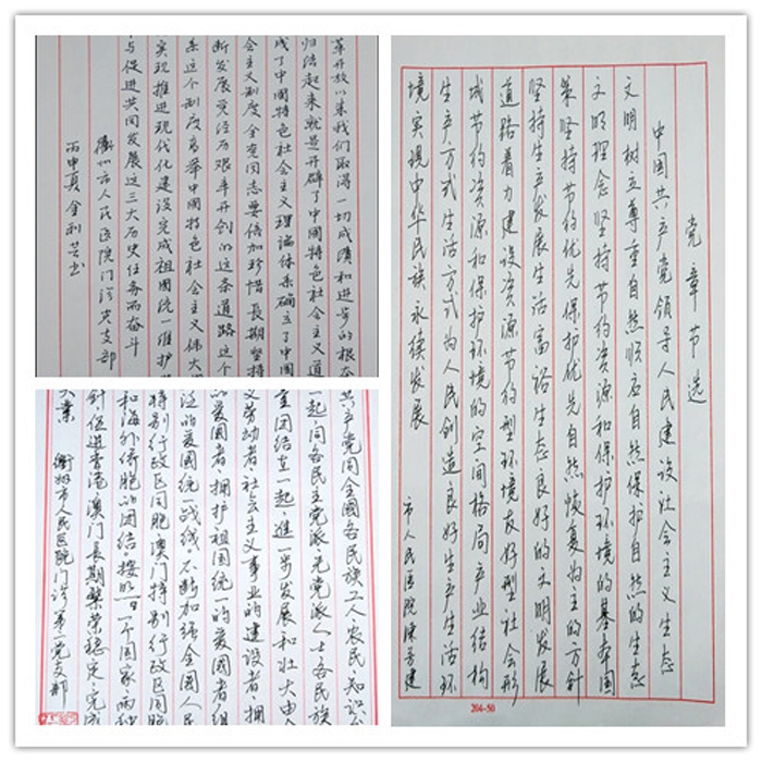 ??? 通過鼓勵創(chuàng)意書寫,在組織黨員開展抄寫黨章的同時,再次重溫黨章精髓,使宗旨意識“入手、入腦、入心”,教育引導(dǎo)廣大黨員干部增強(qiáng)黨性意識,真正做到知行合一,形成正能量和凝聚力。