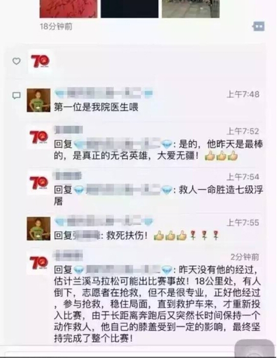 ??? “18公里處,有人倒下,正好他經(jīng)過參與搶救,穩(wěn)住局面,直到救護車來,才投入比賽。由于長距離奔跑后又突然長時間保持一個動作救人,他自己的膝蓋收到一定的影響,最終堅持完成了整個比賽!”