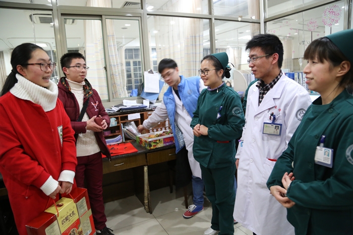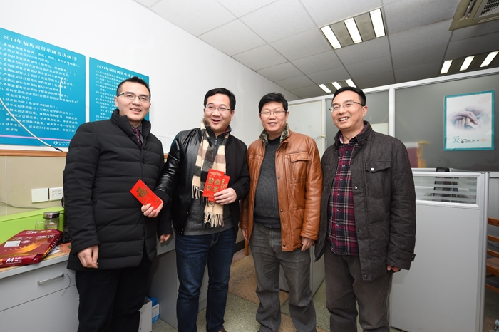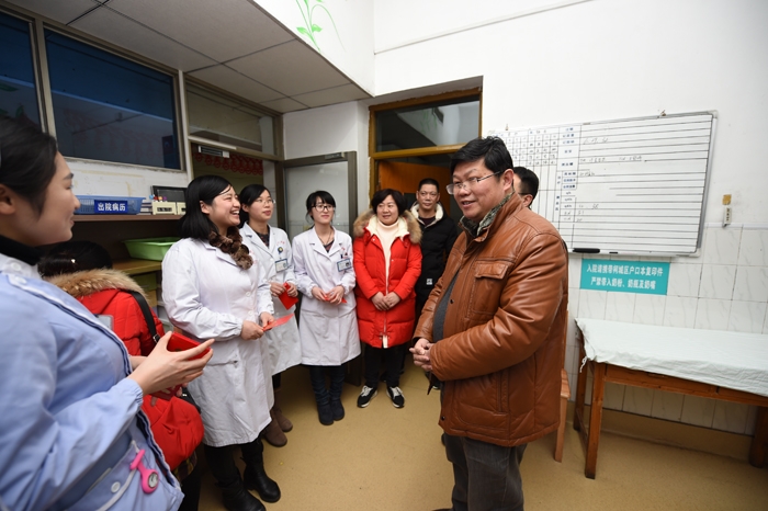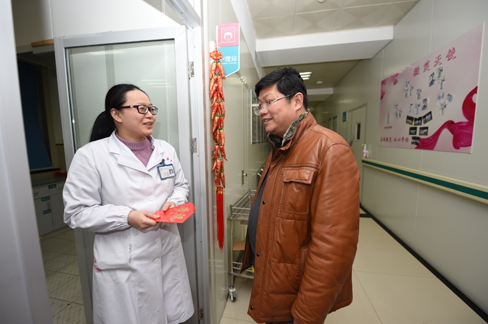 ??? 2月7日晚19:00,院長陳震宏、黨委書記徐天才、副院長王巨宏、胡建邦帶領(lǐng)相關(guān)職能部門負(fù)責(zé)人走訪了急診、臨床病區(qū)、醫(yī)技科室、藥房、后勤等部門,看望慰問堅守在一線的員工,并向他們送去節(jié)日的問候與祝福,讓大家感受到傳統(tǒng)節(jié)日溫馨吉祥和美的氣氛。