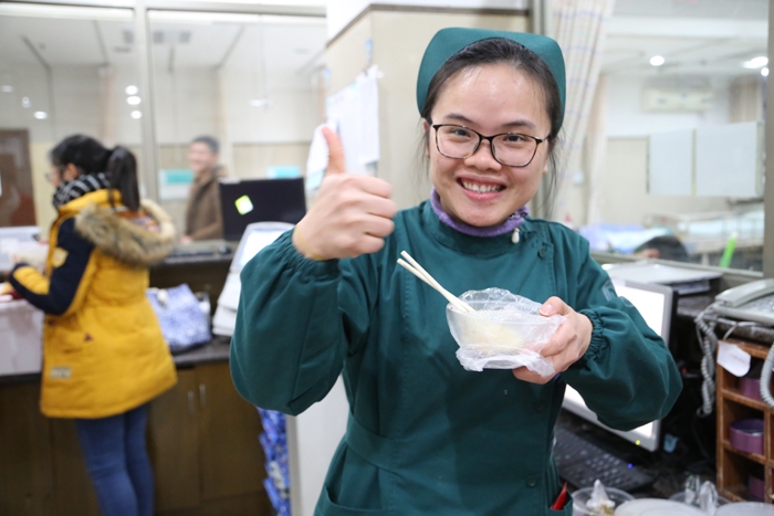 ??? 急診科的小護士笑著說:“我來醫(yī)院工作已18年,年三十值班有10多次了,從來沒有人給我送過餃子,愛心餃好吃!開心!”