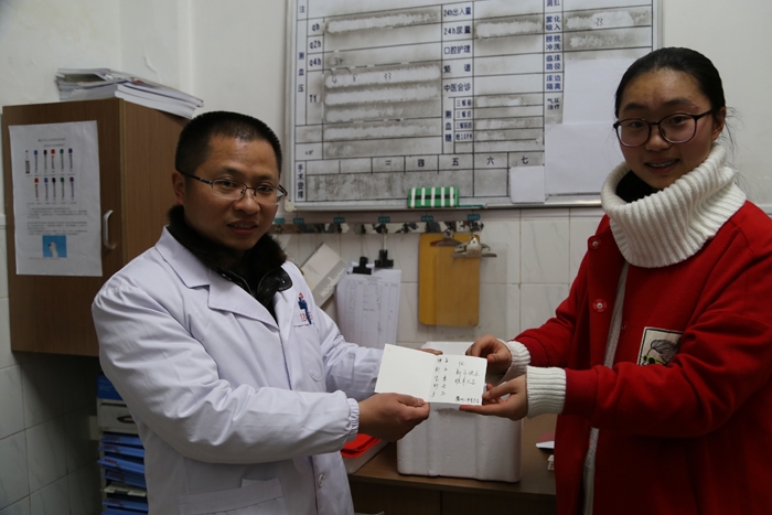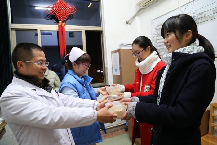 ??? 晚20:30,急診科里來了一批特殊的客人,他們是衢州二中的高二學(xué)生,在學(xué)生會主席陳丹青的帶領(lǐng)下,5位同學(xué)將親手做的熱氣騰騰的餃子送到年三十仍堅守在工作崗位上的醫(yī)生護士們手中。濃濃的香味飄散著,醫(yī)護人員的心里也熱乎乎的。?
