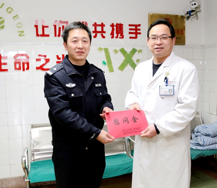 ??? 1月27日,受浙江省見義勇為基金會委托,市公安局工作人員專程來我院看望慰問在偷搶犯罪面前挺身而出的麻醉科余功敏醫(yī)師,代表浙江省人民政府和浙江省公安廳對他勇斗歹徒的義舉進行表彰,并頒發(fā)了見義勇為獎金!