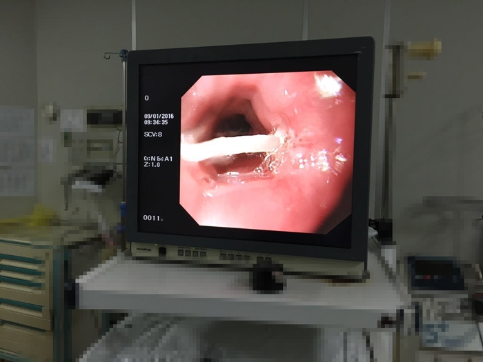 ??? 據(jù)消化內(nèi)鏡中心葉泉忠醫(yī)生介紹,這種情況下,任何輕微的外力刺激,都可能使魚刺刺穿血管導(dǎo)致大出血,患者可能隨時猝死。即使這類險情不發(fā)生,因食管已被刺破,引發(fā)感染后病死率也很高。病情險急,需立即取出魚刺。但因距離患者晚餐后時間太短,擔(dān)心術(shù)中全麻誤吸造成窒息,所以醫(yī)護人員密切監(jiān)護患者的病情變化。次日晨,葉泉忠醫(yī)生在手術(shù)室為徐先生做了無痛內(nèi)鏡下食管異物取出術(shù),取出了一枚2.5cm長的魚刺。