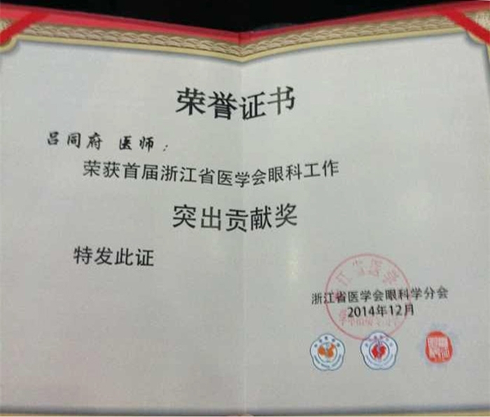 呂同府醫(yī)師榮獲首屆“浙江省醫(yī)學會眼科工作突出貢獻獎”證書
